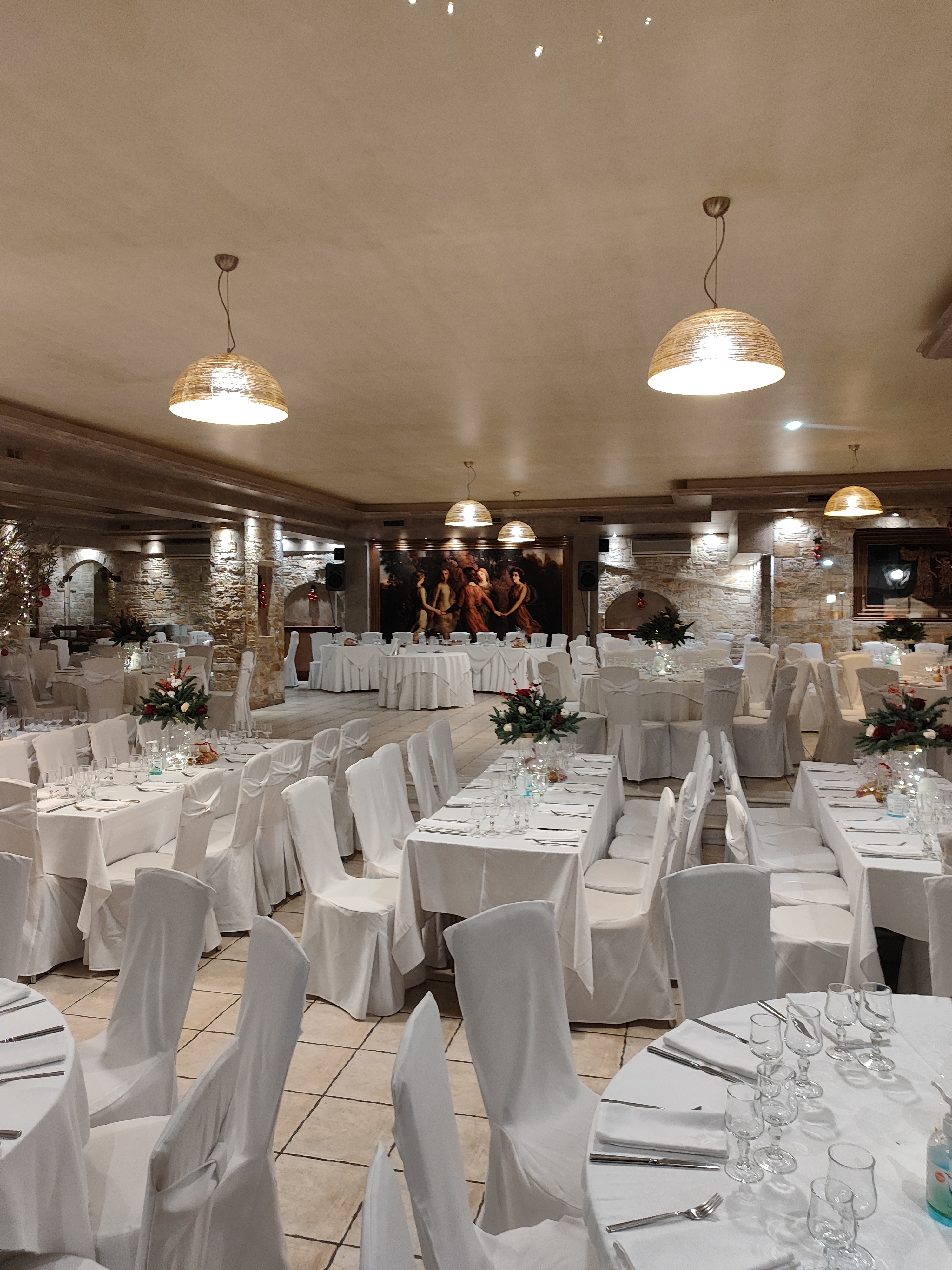 Η αίθουσα είναι επενδυμένη μεπέτραπου συνδυάζεται άριστα αισθητικά με τα ξύλινα παράθυρα. Τα παράθυρα της αίθουσας βλέπουν στον φωτισμένο κήπο που ακόμα και τον χειμώνα μοιάζει παραμυθένιος.